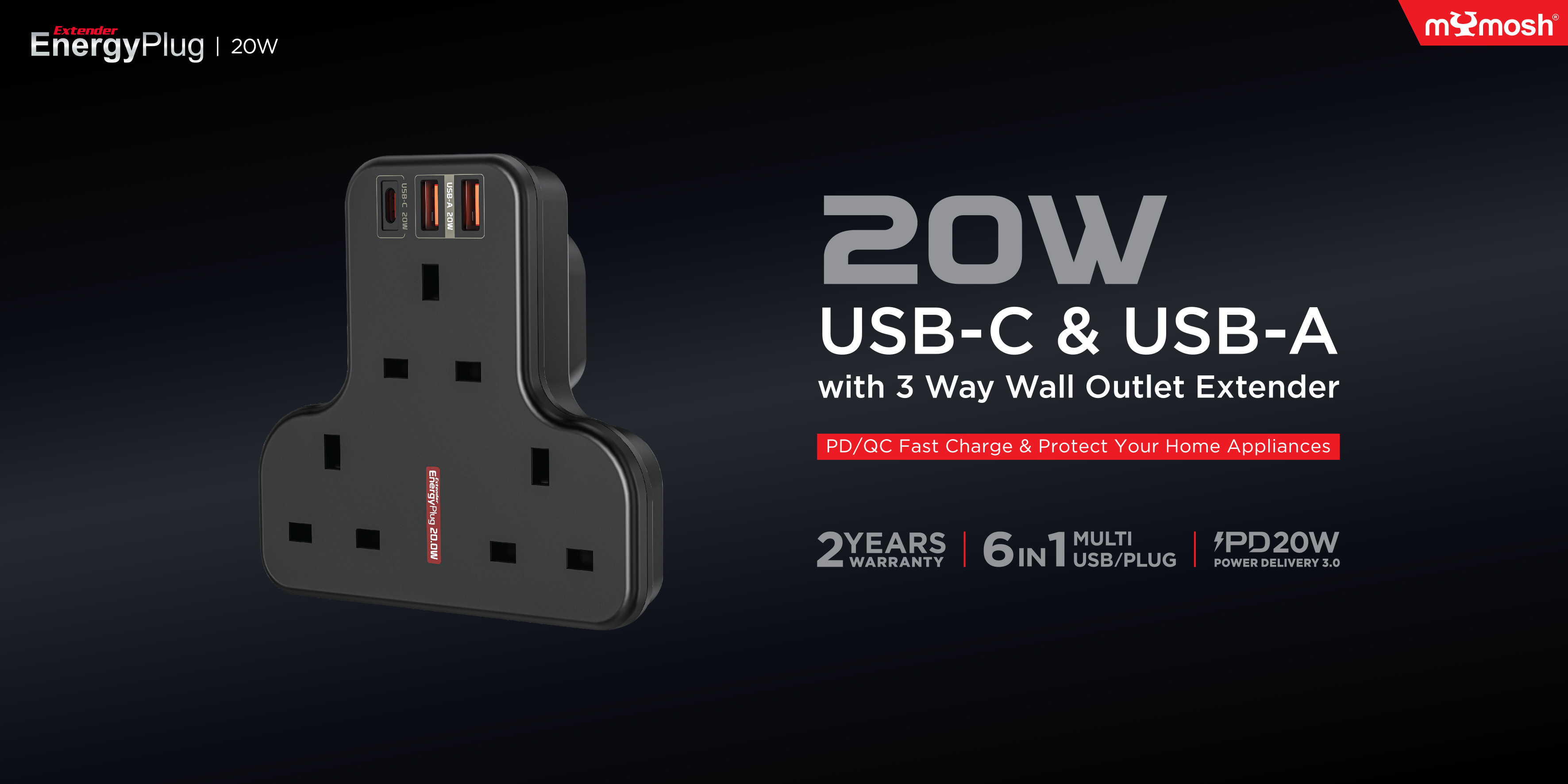 • Model: Extender EnergyPlug 20W USB-C & USB-A 3-Way Wall Outlet Extender