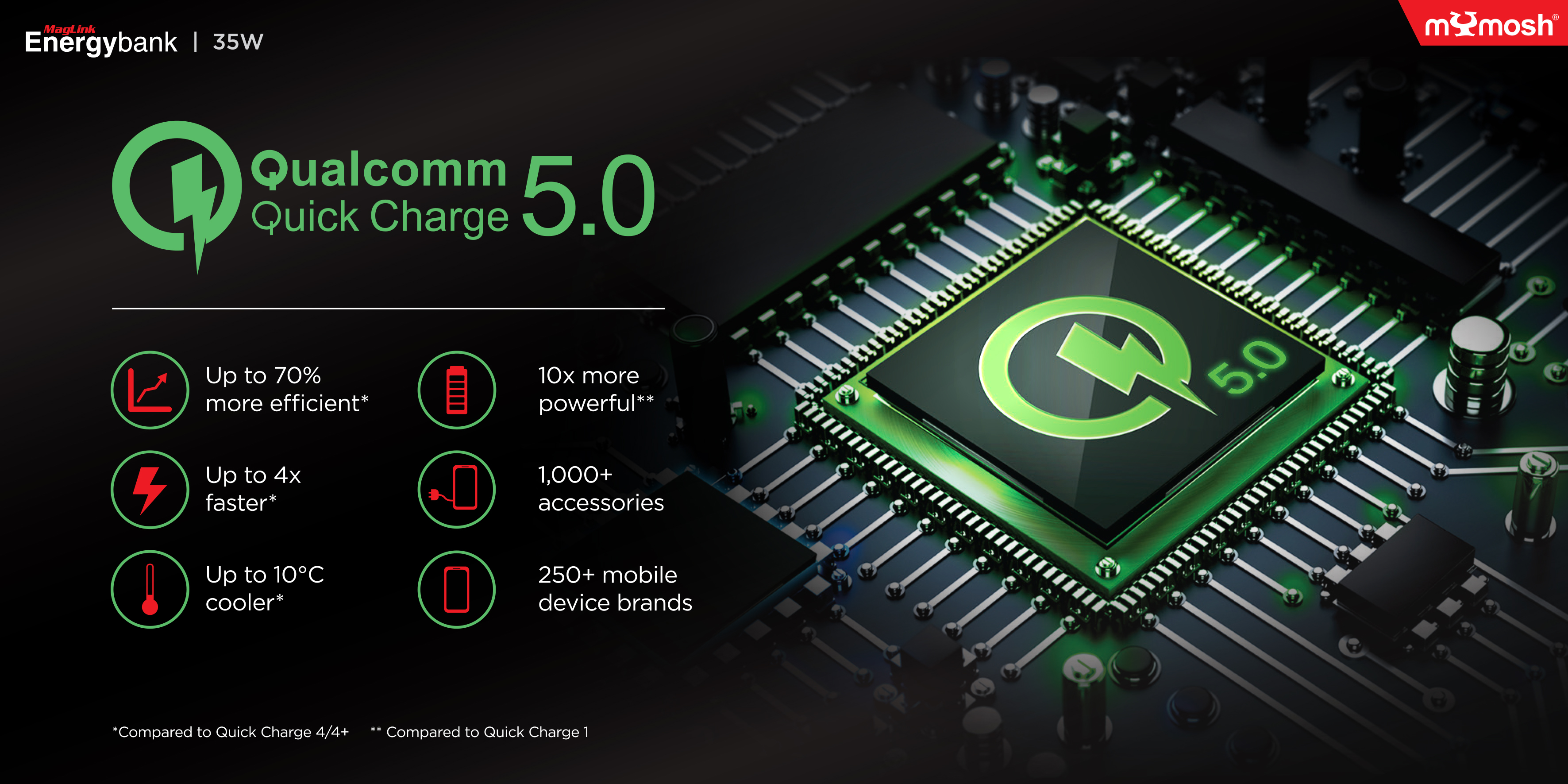 - QC5.0 for Up to 70% more efficient, 10X more Powerful, and compatible with 250+ mobile device brands