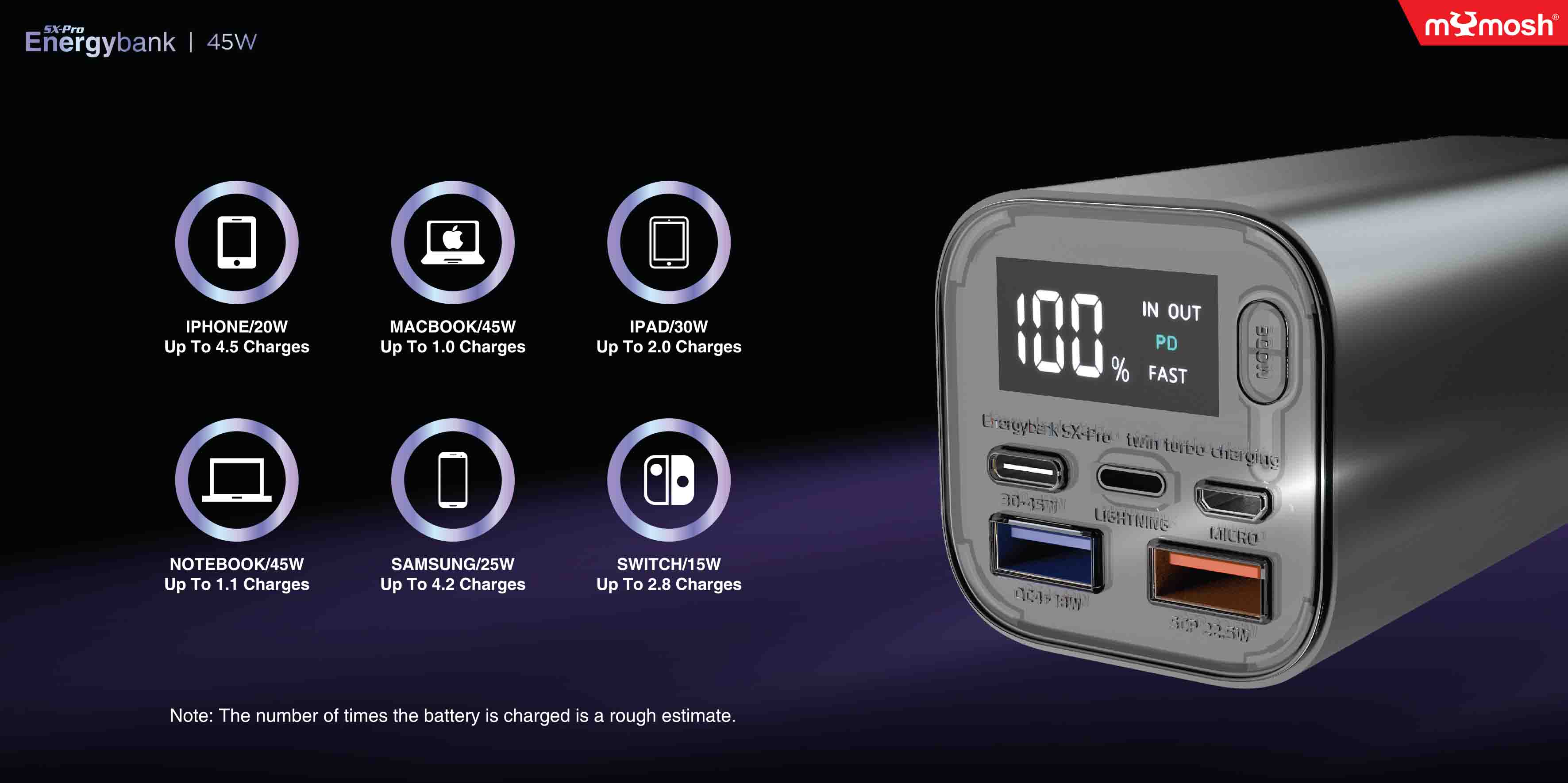 Power bank charging capability: For all your fast-charging solutions: It supports all fast-charging protocols adopted by major brands such as Apple, Samsung, Huawei, HTC, Sony, LG, Mi, Nokia, OnePlus, Realme, and Oppo.